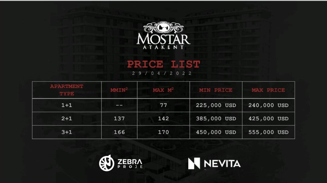 MOSTAR Atakent 137 – 142 M2 2+1 DAİRE 385.000 USD – 425.000 USD